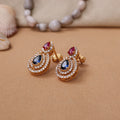 These exquisite teardrop earrings feature a radiant design. Crafted with a gold setting, they are adorned with a vibrant ruby and a stunning blue sapphire, both embraced by a halo of sparkling gemstones. The earrings are designed for a comfortable fit, ideal for pierced ears. These earrings are perfect for adding a touch of elegance to any outfit. The gold setting ensures lasting shine, making them ideal for daily wear or gifting.