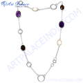 This elegant necklace is crafted from high-quality 925 sterling silver. Featuring a unique design, this necklace showcases a chain interspersed with oval-cut gemstones. The gemstones include amethyst, smoky quartz and citrine, adding a touch of color. This hypoallergenic necklace is ideal for sensitive skin. The secure clasp ensures comfortable wear. Perfect for adding a touch of sophistication to any outfit, this necklace is ideal for daily wear or gifting. The durable design ensures longevity.