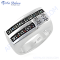 Este impactante anillo está elaborado en resistente plata de ley 925. Su diseño rectangular presenta dos bandas adornadas con gemas y estrellas. Las gemas crean un vibrante contraste con la plata pulida. Es ideal para hombres que buscan un accesorio atrevido. Su fabricación en plata de ley garantiza una larga duración y es resistente al deslustre. Perfecto como pieza única o como un regalo memorable. Su diseño robusto está hecho para el uso diario. Elija este anillo por su excepcional artesanía y su diseño distintivo.