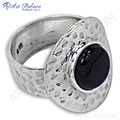 Hammered sterling silver ring with a large, polished black onyx gemstone center, perfect for women's fashion jewelry.