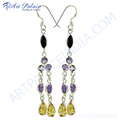 925 Silver Gemstone Dangle Earrings | Purple & Yellow | Gift