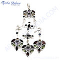 Sterling silver gemstone pendant necklace featuring a colorful mix of gemstones and elegant design.