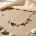 This elegant necklace features a delicate design crafted from 925 sterling silver. The necklace showcases intricate rose-shaped links, each meticulously designed. Adorning the necklace are vibrant, genuine ruby gemstones, adding a touch of color and sophistication. The necklace is ideal for daily wear or gifting, offering a blend of classic design and enduring quality. It is a perfect choice for those who appreciate fine craftsmanship and timeless style. The necklace's secure clasp ensures a comfortable and reliable fit.