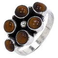 This elegant ring features a cluster design of genuine tiger eye gemstones set in polished 925 sterling silver. The ring showcases a unique arrangement of round, cabochon-cut tiger eye stones. This ring offers a classic yet distinctive look. Crafted from high-quality sterling silver, this ring is designed for durability and daily wear. The gemstones are known for their chatoyancy and warm color. This ring is a perfect gift. The ring is ideal for daily wear or gifting.