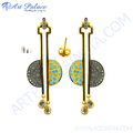 These exquisite gold dangle earrings feature a unique design with a combination of sparkling blue gemstones and elegant gold accents. Crafted with meticulous attention to detail, these earrings are designed to elevate any ensemble. The intricate craftsmanship ensures a long-lasting piece of jewelry. The earrings are ideal for daily wear or gifting, making them a versatile addition to any jewelry collection. These earrings are made of gold and feature a secure and comfortable closure, perfect for any occasion.