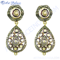 Gold teardrop dangle earrings with diamonds set in an ornate frame, a beautiful piece of luxury jewelry.