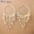 Gold hoop earrings with cascading strands of light pink gemstones, creating a beautiful dangle effect.