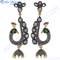 Peacock dangle earrings with green enamel detailing, diamonds, and black metal accents on a white background.