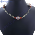 Pearl chain necklace with silver chain and brown beads on a black mannequin.