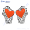 银色心形耳环,饰以橙色珐琅和立方氧化锆