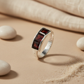 This elegant ring features a striking design with three rectangular-cut garnet gemstones set in a polished 925 sterling silver band. The rich, deep red color of the garnet is beautifully complemented by the bright silver. This ring is ideal for those who appreciate the beauty of gemstone jewelry. The ring is crafted from hypoallergenic materials, suitable for sensitive skin. This ring is perfect for daily wear or gifting and can add a touch of sophistication to any outfit. The ring showcases a quality craftsmanship and durability.